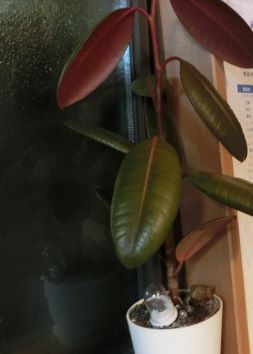 子分①の部屋に置いていた観葉植物のゴムの木を、しぐれちゃんを飼い始めた当初、床に置いていたら、齧ったことがあったな…と思い出して一句。食べちゃいけない観葉植物というこの木。今はキッチンの窓際に置いてます。